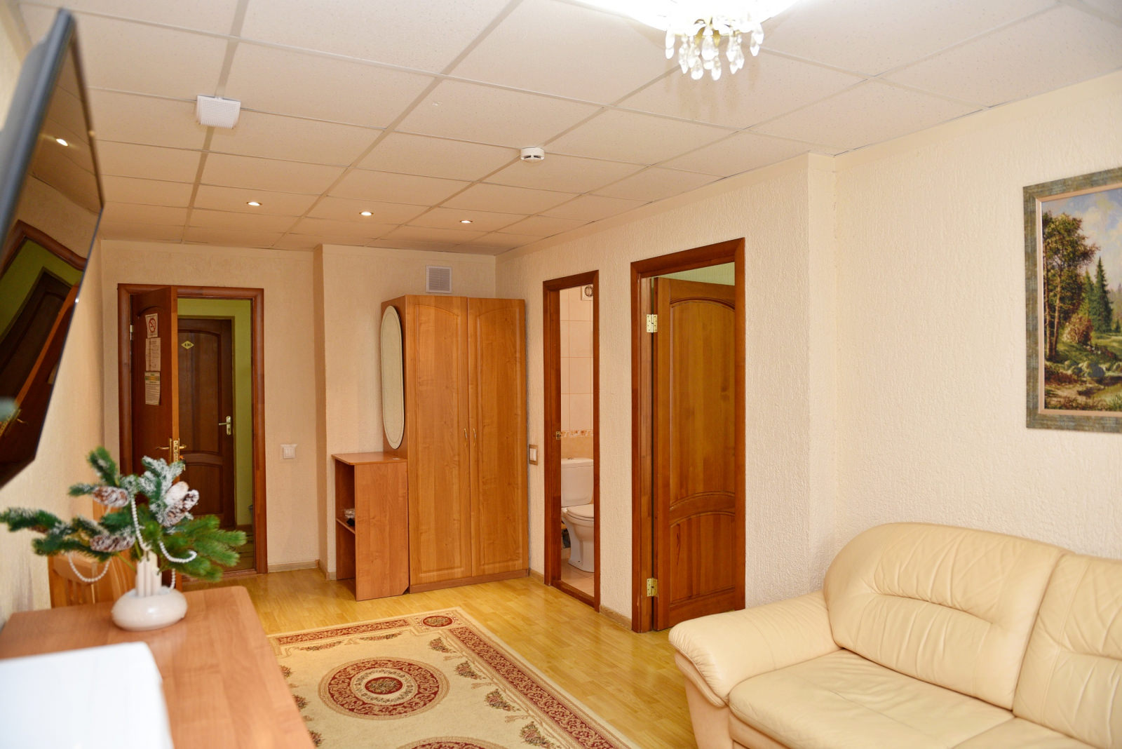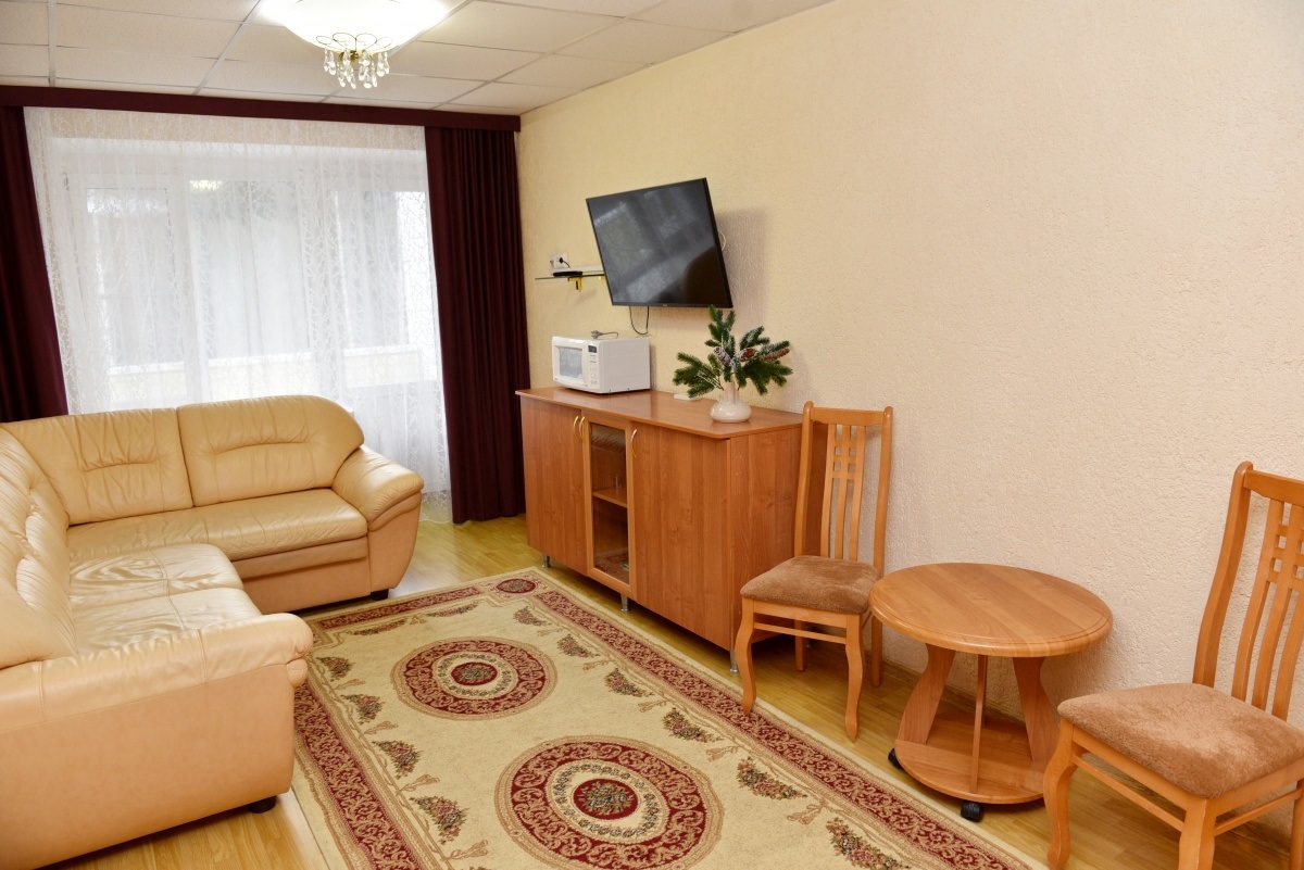 Площадь номера - 31 кв.м. 2 осн. места. 1 доп. место. Балкон. Мебель: вешалка, диван раскладной, зеркало, кровать двуспальная, прикроватные тумбочки, столик журнальный, стулья, шкаф. Оборудование: гладильная доска, кондиционер, набор посуды, телевизор ЖК, утюг, холодильник, чайный набор посуды, электрочайник. Санузел: с ванной, тапочки, туалетные принадлежности, фен, халат. Сервис: Wi-Fi бесплатно, смена полотенец, смена постельного белья, уборка номера.